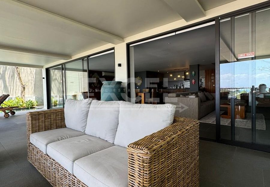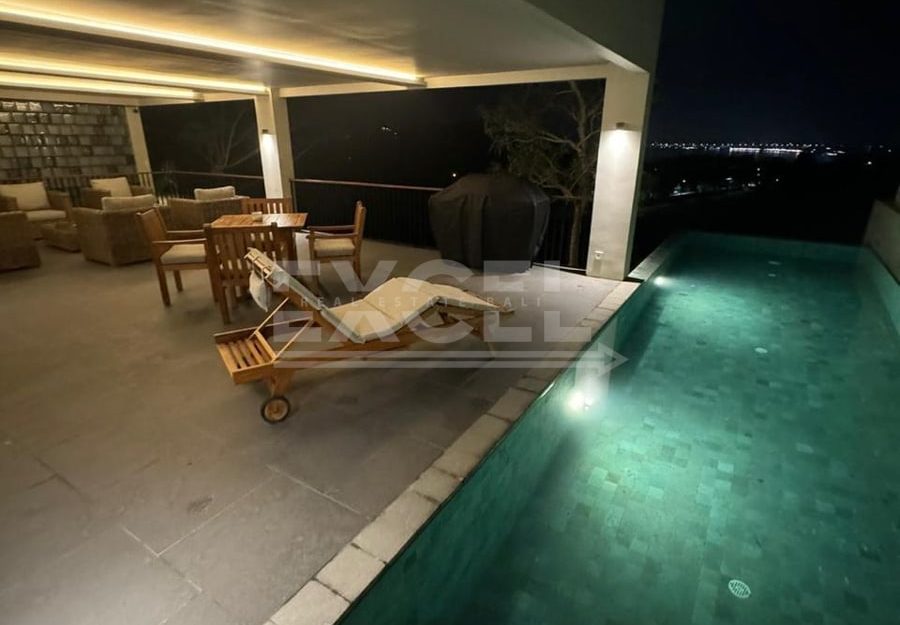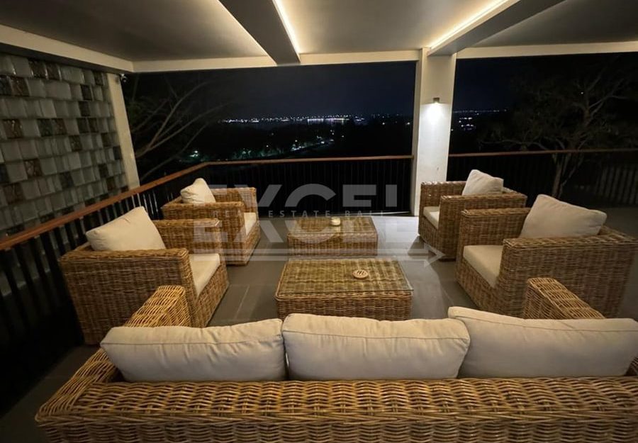 This newly renovated unique 4 bedroom villa with stunning views of Jimbaran Bay and beyond, is now available for yearly rental. The villa has been designed and completed to make this villa a perfect family residence located with a high end secure neighbourhood. A short drive will take you to the famous Jimbaran Bay that has a great selection of seafood restaurants along with upscale restaurants. Supermarkets, shops and the International school are all in easy reach from the villa.