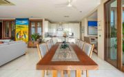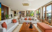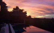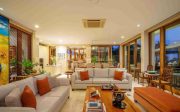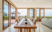 Set in a large landscaped garden, the Villa’s airy dining and living rooms open on to the terrace and pool area, which are complemented by a restful bale, a timber deck and BBQ area. Two kitchens and a fully-equipped bar provide for a wide range of dining and entertainment possibilities. The main bedroom, with dressing room and bathroom, fronts the terrace and pool area, and two large upstairs bedrooms, complete with ensuite bathrooms, open on to the balcony circling the second-floor level. A large upstairs study extends to an open-air sitting area, and clear glass balustrading maximises the superb views.