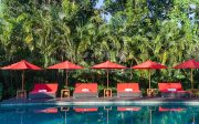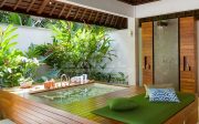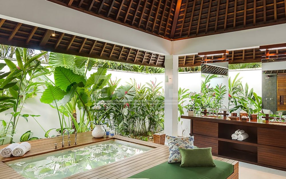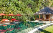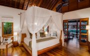 The villa’s two magnificent master suites each have enormous balconies and direct access to the 21-metre pool where stepping stones create a shallow section that’s almost like a private pool for each suite. The balconies are furnished with armchairs and a huge 4 x 2m daybed.. Within each suite is a four-poster bed swathed in mosquito netting, alcove seating and armchairs set before a 32-inch TV. The master bathrooms are palatial, with twin basins, rain shower and, facing a bank of tropical greenery, statement bathtub set into a nautical-style teakwood platform with recessed seating.