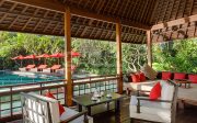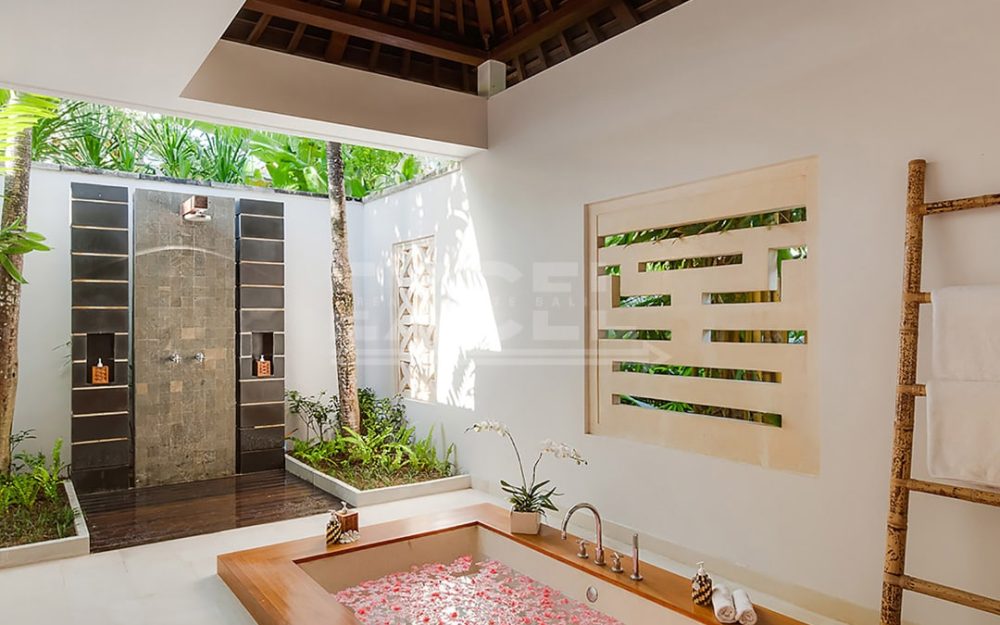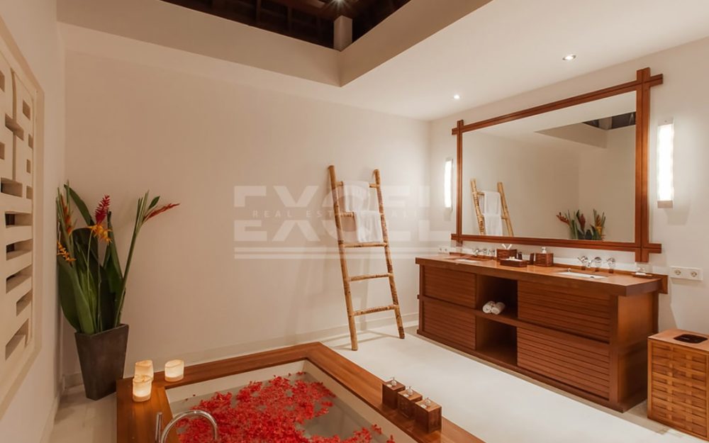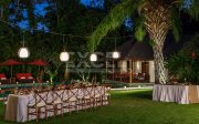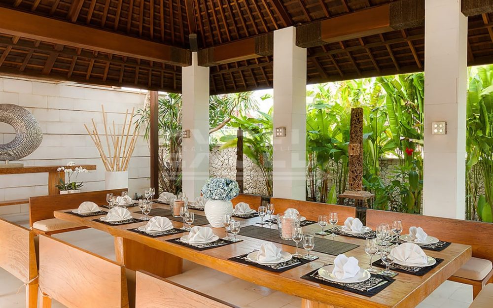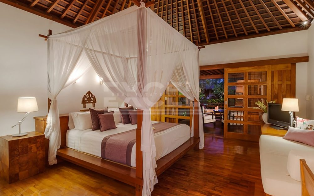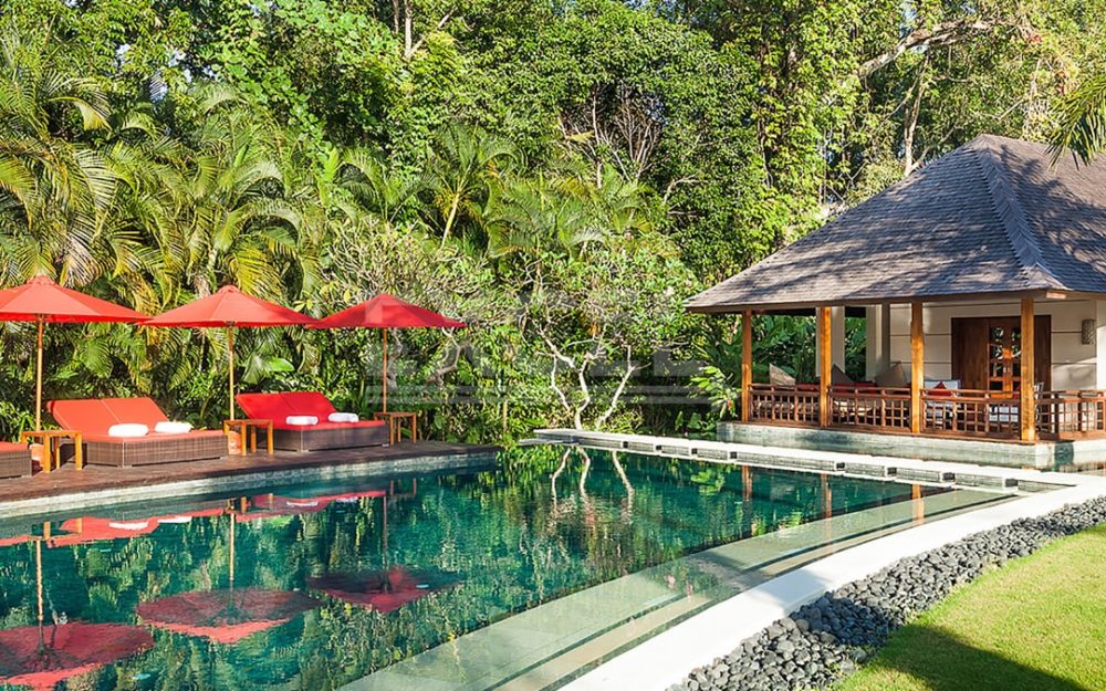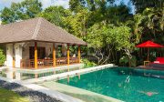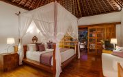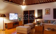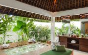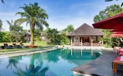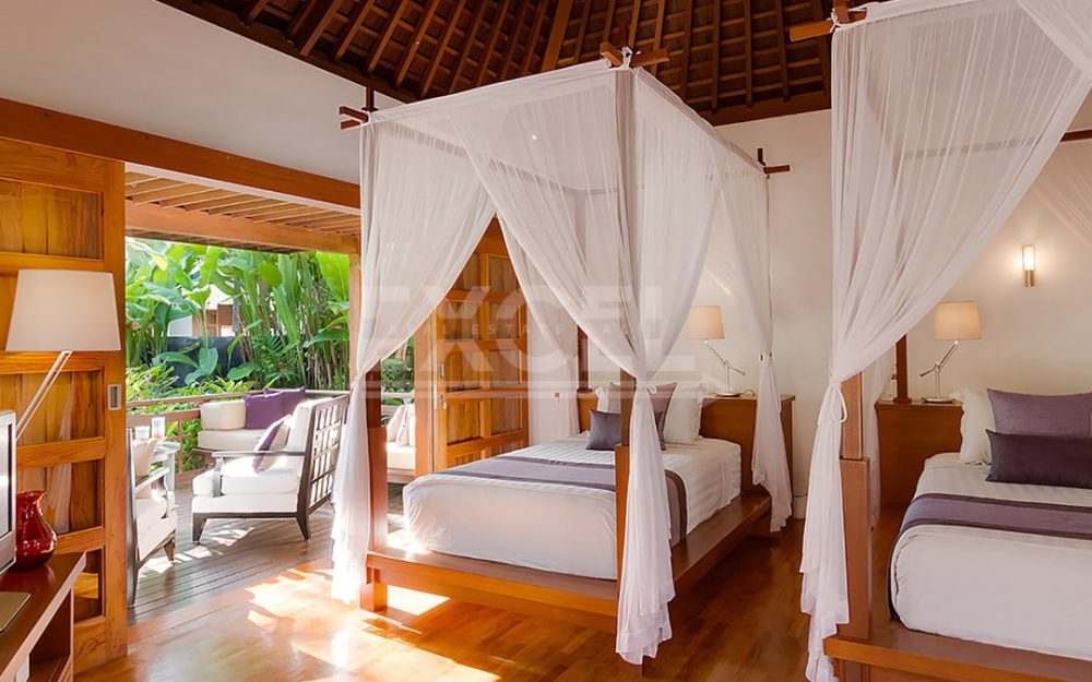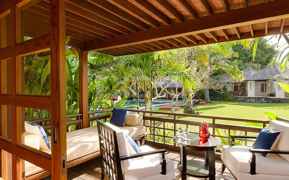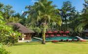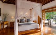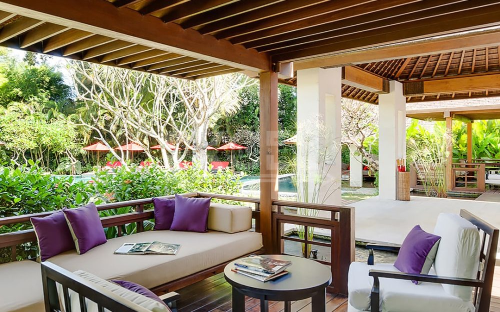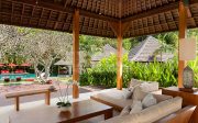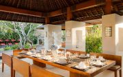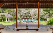 The villa offers six unusually spacious and superbly decorated bedroom suites, each occupying its own luxury pavilion, with four-poster beds sitting on parquet floors, enormous semi-alfresco bathrooms and a large covered balcony or terrace with built-in daybed and armchairs. High-end furnishings include King Koil mattresses dressed in quality cotton bedding, there’s a choice of air-conditioning or ceiling fan.
