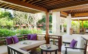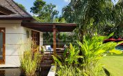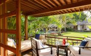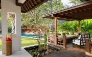 The four guest suites occupy individual pavilions arranged in pairs on either side of the lawn. Separated by an open-sided lounge with steps across a koi pond, each pair comprises a suite with a four-poster super-king bed, and a suite with two four-poster single beds.. Each suite has a desk, seating before a 26-inch TV , a dressing area, and bathrooms with twin sinks and sunken bathtub, and an alfresco rain shower. Facing the lawn and surrounded by tropical greenery, each suite’s large terrace has comfortable built-in seating and armchairs.