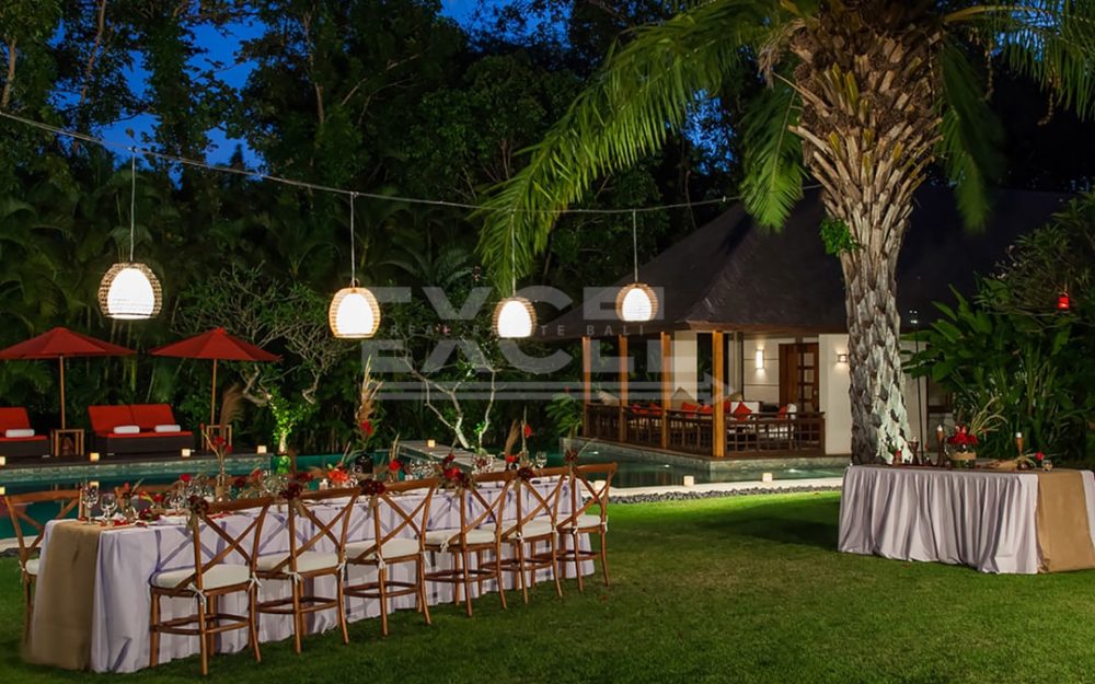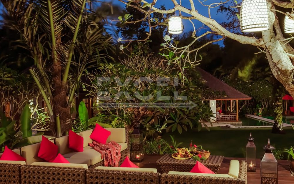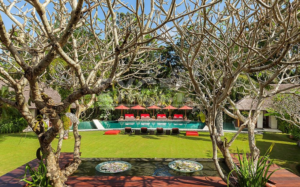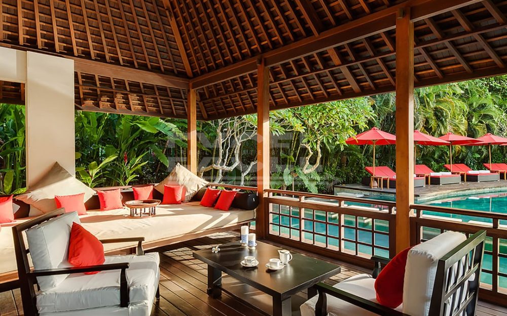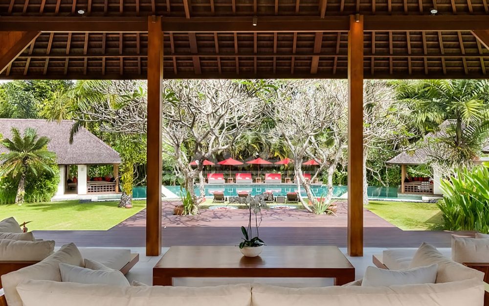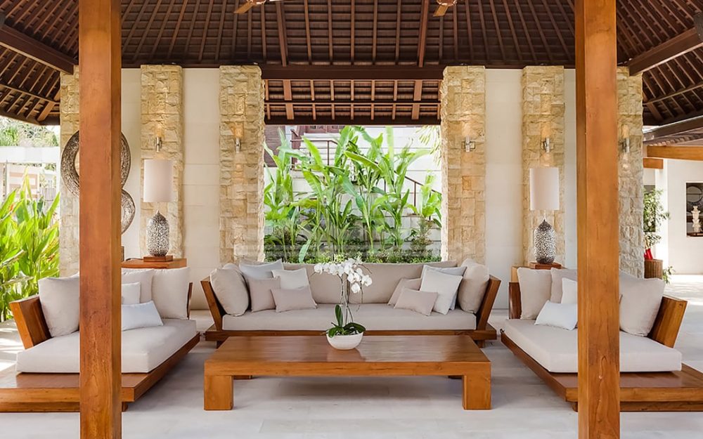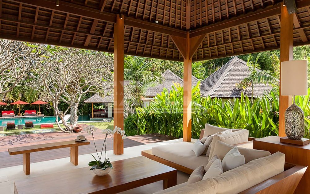 The breezy fan-cooled living pavilion on the upper terrace presides over sweeping view towards the pool beyond a water-wall cascading to the lawn. Supremely comfortable sofas invite conversation and repose in equal measures.