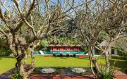 In a contemporary interpretation of traditional Balinese living, the villa comprises a dozen living and sleeping pavilions loosely arranged in a U-shape within the spacious 5690m2 property, fanning out from the lawn and 21-metre swimming pool. From the entrance, a path leads to the open-sided living pavilion and, beyond an alfresco decked sitting area, the dining pavilion, with a western kitchen behind, a guest washroom, and steps to the media room above. Mirrored on either side of the lawn are two guest bedroom pavilions with open-sided lounges in between, and the two master bedroom pavilions facing each other across the length of the pool.