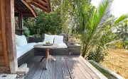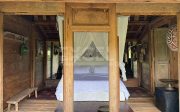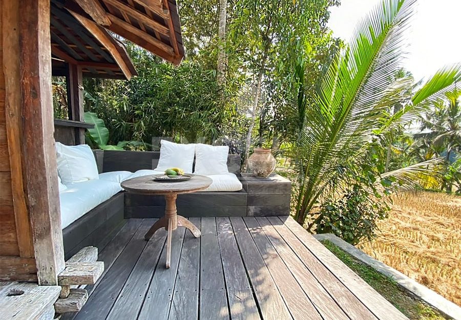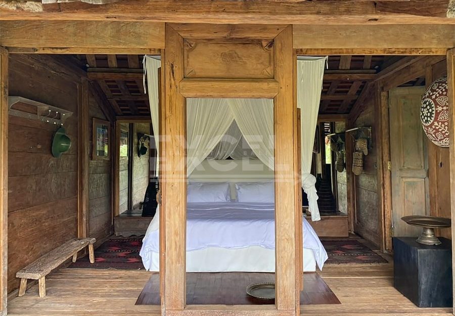 The guest bedroom is a true highlight, housed in an original old geladak—a beautifully preserved traditional wooden structure. With its en-suite bathroom and breathtaking views of Gunung Agung, this space combines rustic charm with modern comfort, making it an unforgettable retreat for visitors.