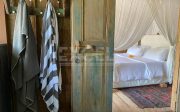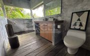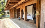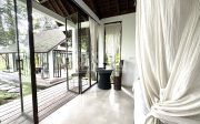 The master bedroom, set apart from the main building. Large windows bathe the space in natural light while offering peaceful views of the surrounding greenery. An attached bathroom enhances the feeling of luxury and seclusion.
