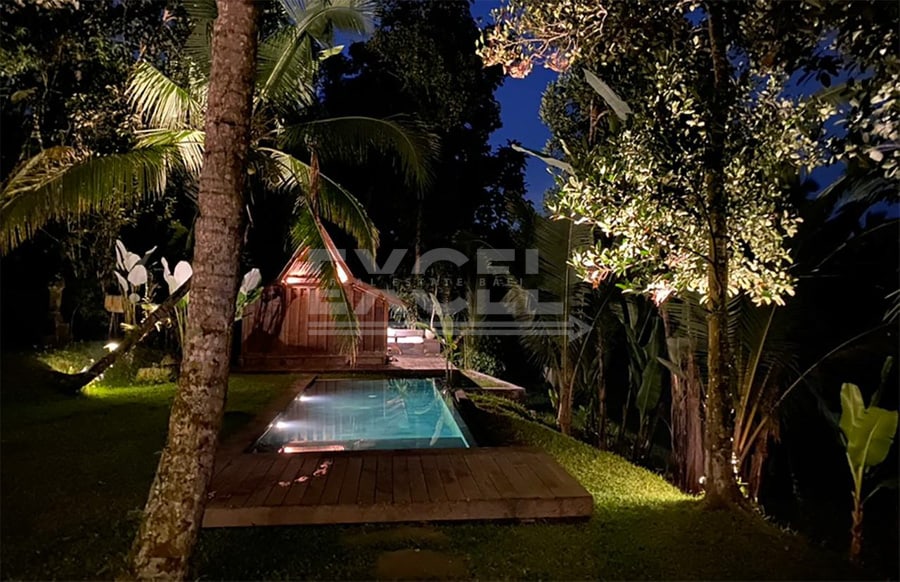 At the heart of the property lies the swimming pool, gracefully set in the middle of the lush garden. Surrounded by vibrant greenery and a variety of fruit trees adding to the villa’s tropical allure, the pool offers a serene and private oasis for relaxation and leisure.