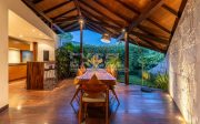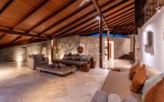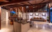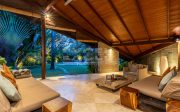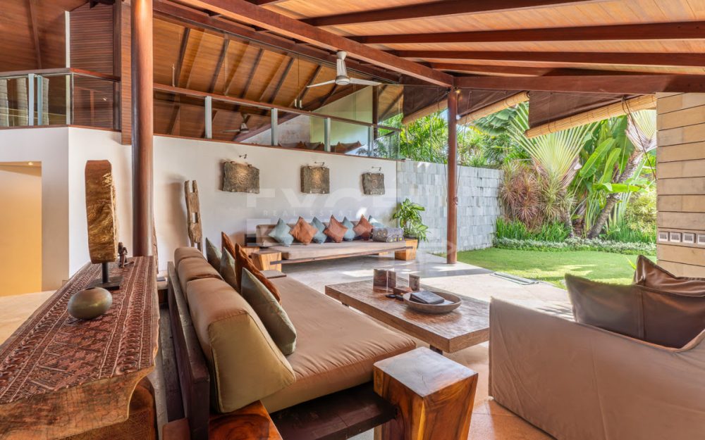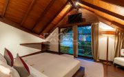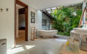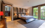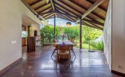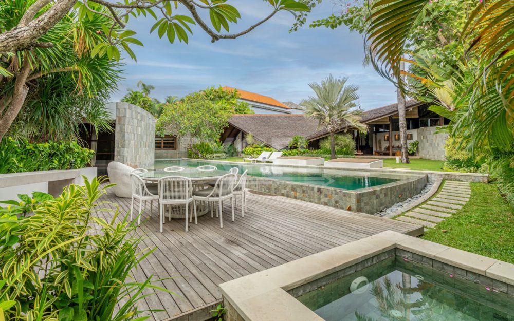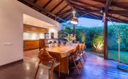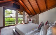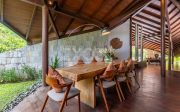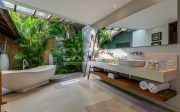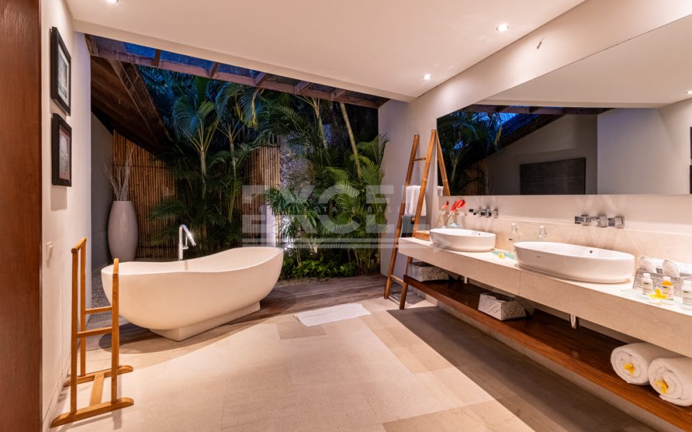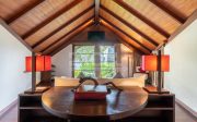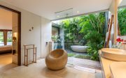 Discreetly tucked off the living room in the main villa are the three large, air-conditioned, guest bedrooms, each with a unique charm. One is multi-level, with the king-sized bed on a raised Merbau-wood platform facing the pool, and a dressing area and large garden bathroom (with twin basins, indoor and outdoor showers and a bathtub) on the lower level. The two other bedrooms – one with a king, the other with twin beds – look onto their own corner gardens and also have indoor/outdoor bathrooms with bathtub, shower enclosure, and twin basins.