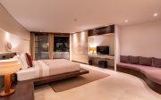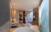 A curved display wall creates an imposing backdrop to the master suite’s king-sized leather-and-wood bed which faces a bank of wardrobes and a desk set below a wall-mounted TV. A corner banquette looks onto a small garden open to the bathroom, where there’s a terrazzo bathtub, vanity with twin basins, shower enclosure and second alfresco shower.