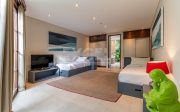 This must see four-bedroom villa has stone slabs across a lily pond. that lead into an open-plan living room that flows around contoured and angled walls towards the garden. A few steps up is a mezzanine media room where a glazed wall looks down over the living area; tucked below is a guest bedroom. At one end of the living space is a raised dining area, beyond which is a breakfast bar and the fitted kitchen. At the opposite end is a sitting area open to the garden. A corridor leads to a guest cloakroom and second guest bedroom, while, discreetly tucked behind another feature wall is a third guestroom with doors to the garden.