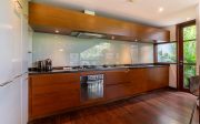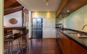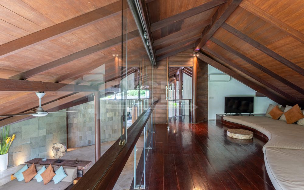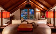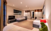 The large split-level living room provides a perfect balance of sociable open-plan entertainment space and quiet get-away-from-it-all corners. On a raised platform of polished Merbau wood, a dining table for eight is separated from the well-equipped kitchen by a bar counter. On the lower level, sofas are arranged around a coffee table overlooking the garden and pool. Above is a mezzanine media room where sensually curved seating runs the full length of one wall.