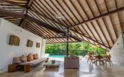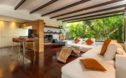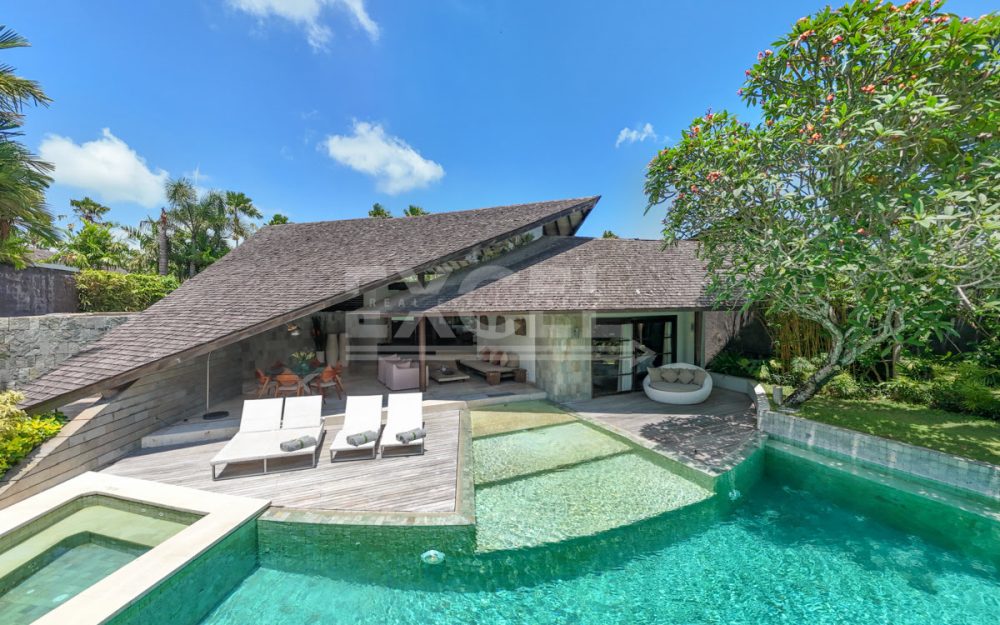 The three-bedroom villa features striking changes of floor level to create interest and define spaces. The huge open living and dining room fans out from a raised platform alongside the kitchen, widening to the garden and pool area at the front. Secluded on separate sides of this vast living area, the three bedroom suites each enjoy complete privacy and outdoor space in the form of a deck, terrace or bathroom garden.