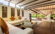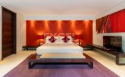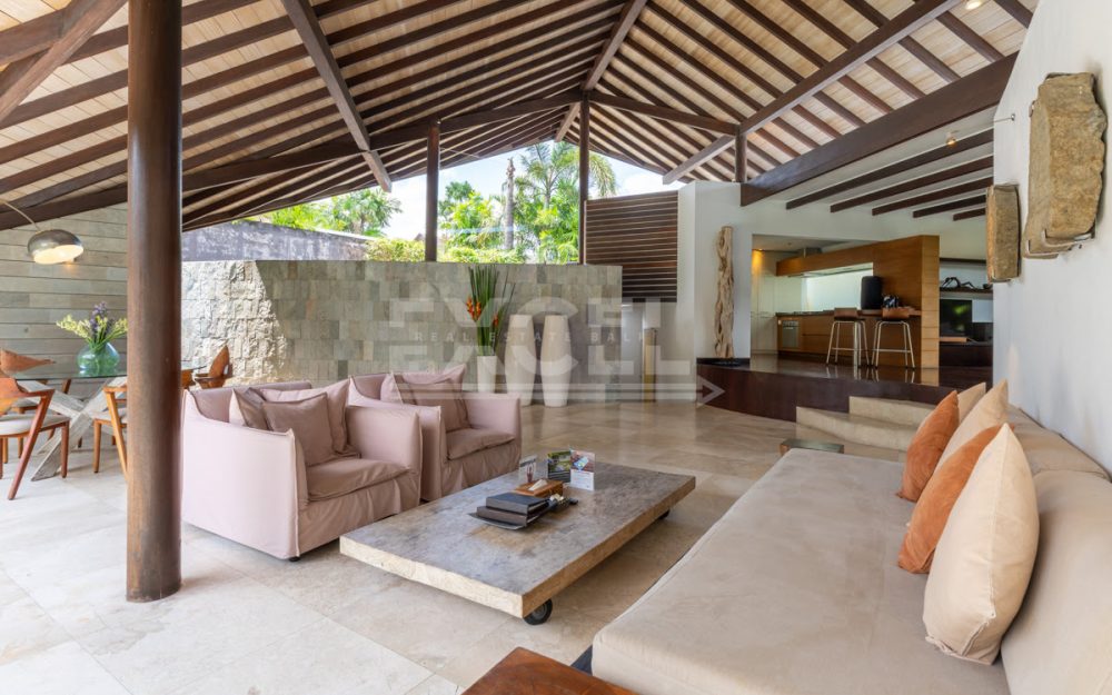 A light-flooded living and dining area, defined by dramatic overlapping roofs and a mix of angled and curved walls forms the heart of the villa. Handsome furniture rests on the acid-washed marble floors that flow unrestricted from the edge of the pool to a raised area of polished Merbau-wood opening onto a very well equipped kitchen.