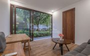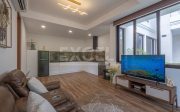 The villa is actually two houses with one shared wall, providing ample space for families or groups of friends. The first house is a single-story bungalow with one bedroom, one bathroom, one kitchen, and one living area. The second house is a two-story building with two bedrooms, two bathrooms, one kitchen and dining area, one living area downstairs, one living area/office upstairs, one gym/hobby room, two small store rooms, and laundry facilities.