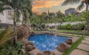 The outdoor living space is equally impressive; sit and relax or enjoy a meal in the 30 m2 undercover lounge/dining area and gaze out over the large garden, which includes a 6×6 meter pool, a koi pond, and an artificial river. The pool has a faux stone rockpool finish, which gives it a natural and inviting appearance. The garden reflects romantic Bali, the ideal place to unwind and soak up the sun while listening to the sounds of nature as water flows and birds sing.
