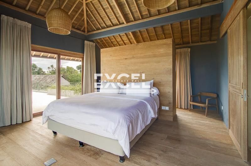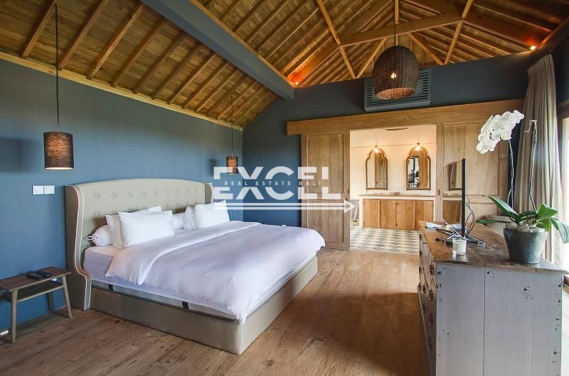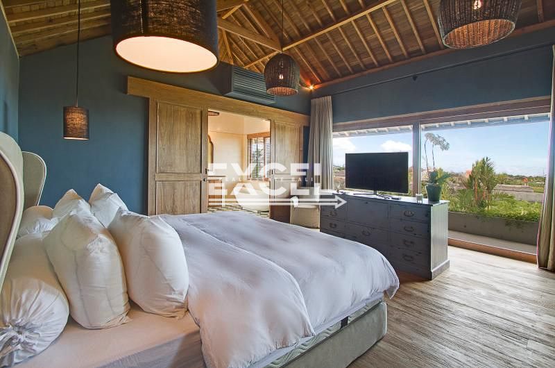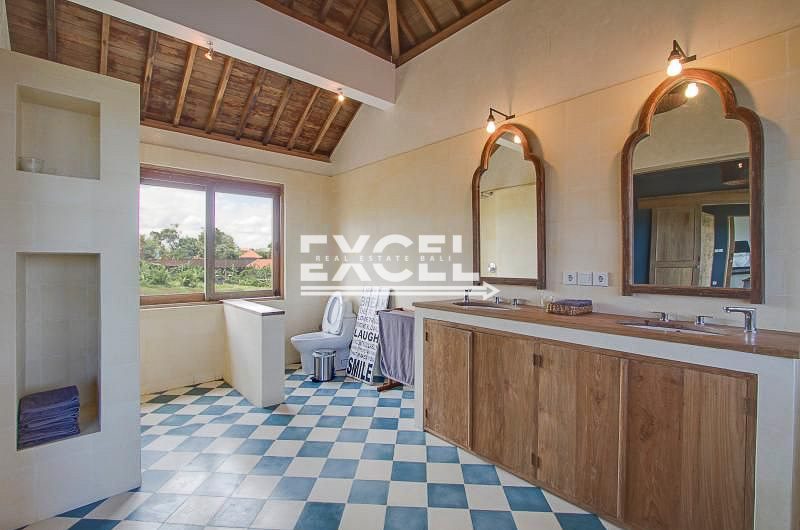 The master bedroom suite at the villa is located on the second story with wall-to-wall glass doors, allowing in plenty of natural light as well as panorama views of the open space around the villa. Featured by King size bed, en-suite bathroom, flat screen television, air conditioner and safe. The en-suite bathroom features a low ceramic bathtub, rain shower and twin sink basins on top of the blue and white tiles. On the side, it has a spacious rooftop terrace facing gorgeous view of greens rice fields, definitely the place to be as the sun drops down over the horizon.
