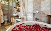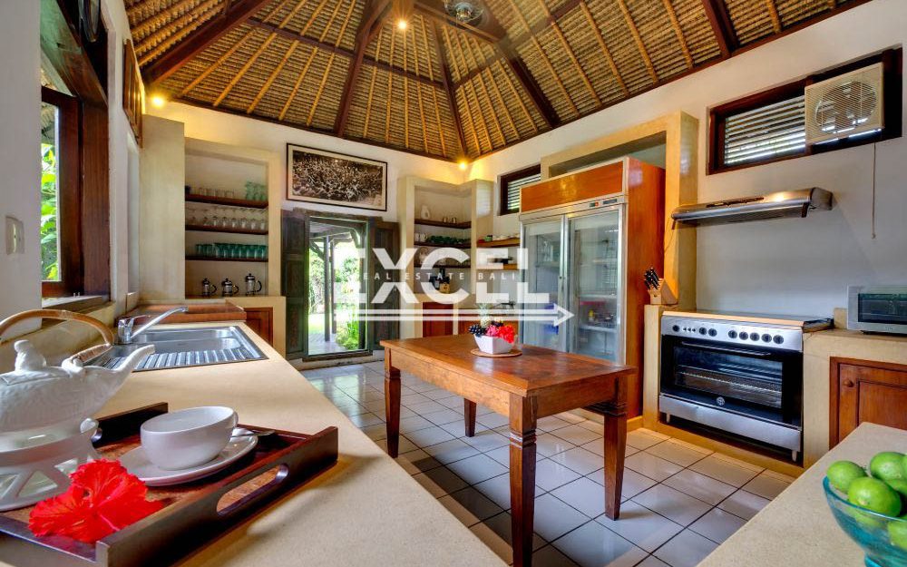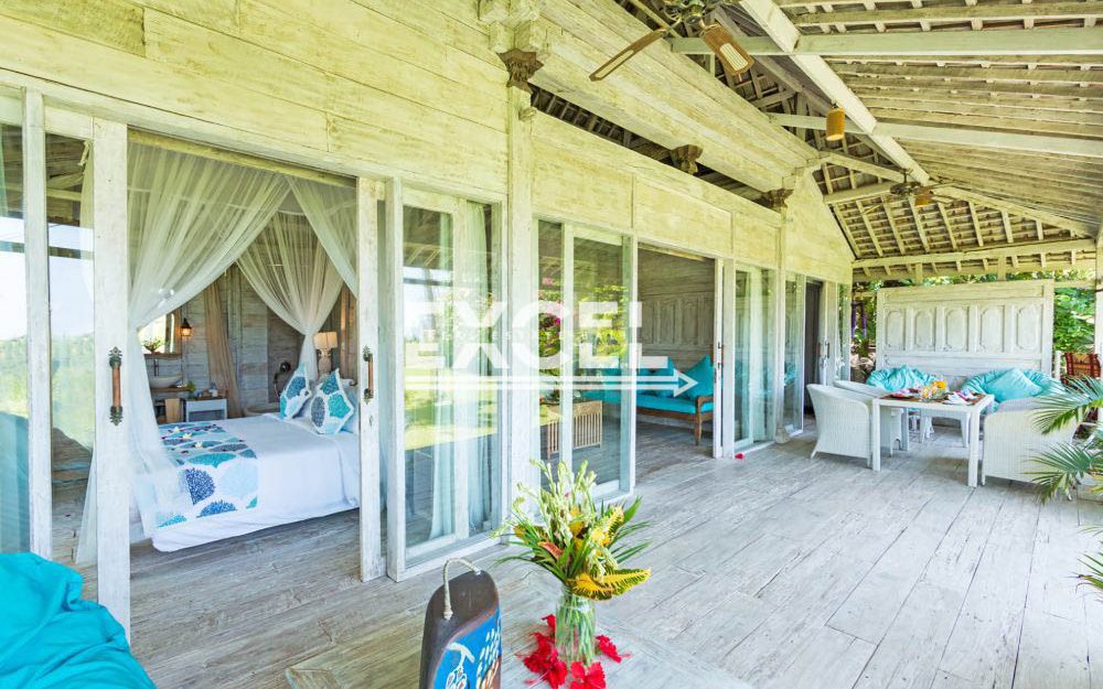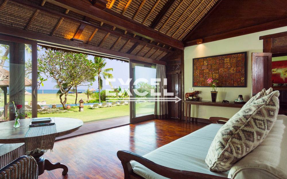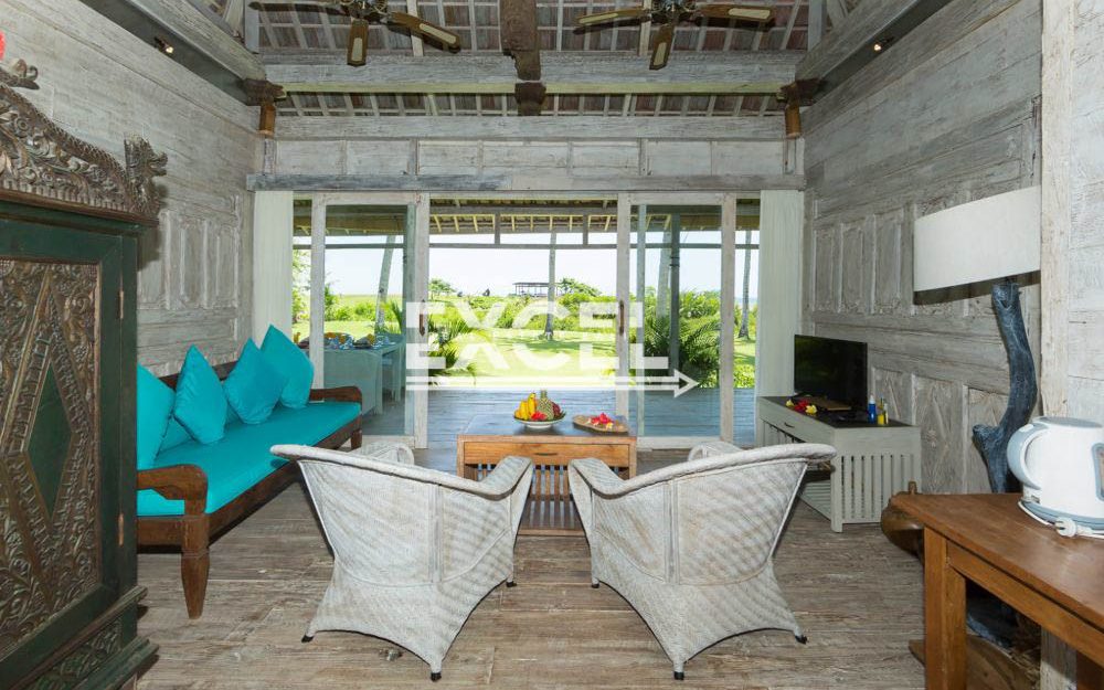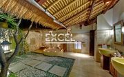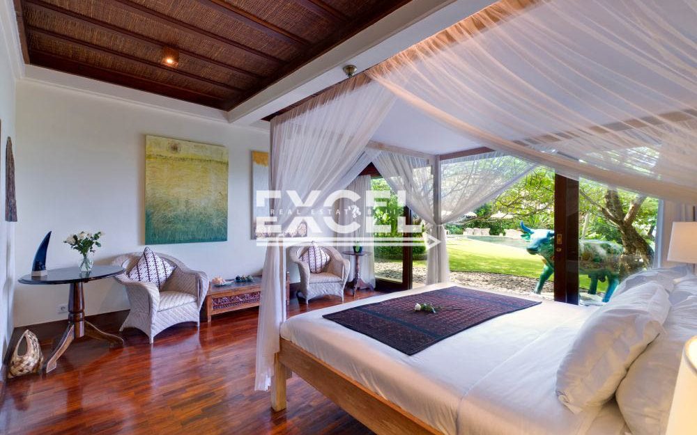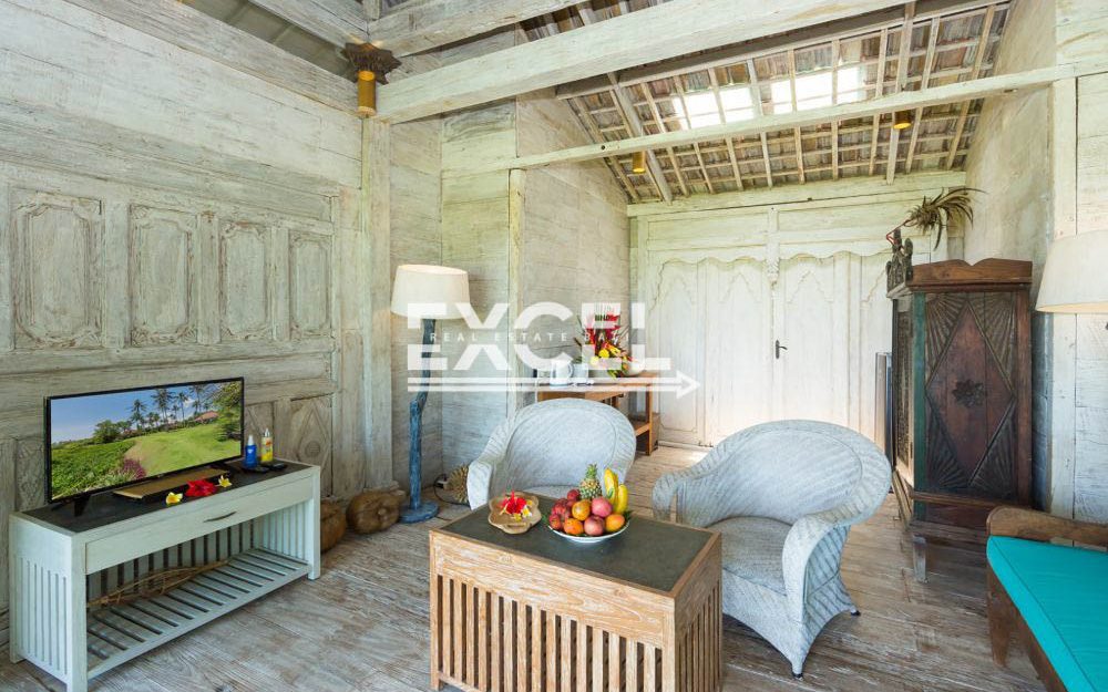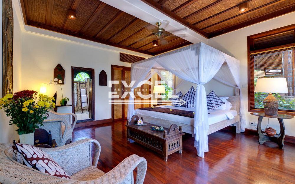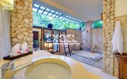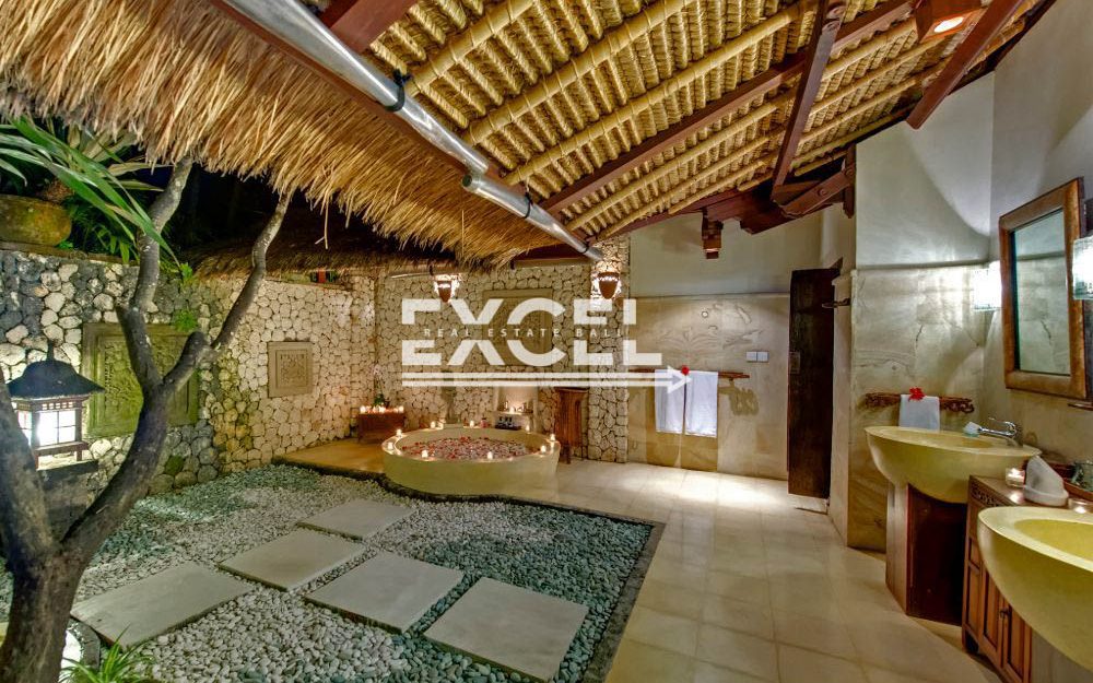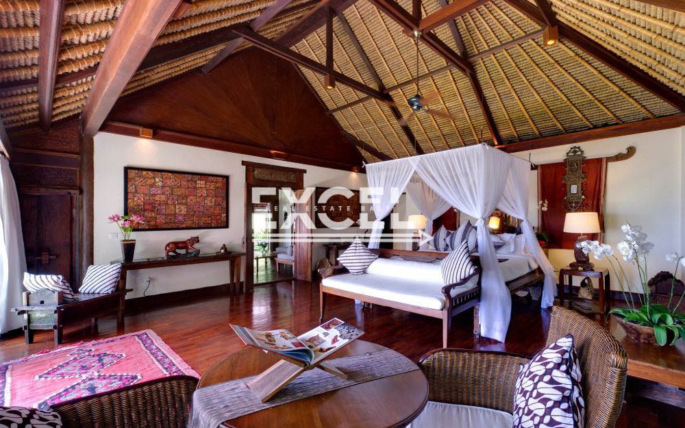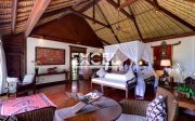 The liberal use of local materials – exotic hardwood and terrazzo floors, coral-limestone walls and vaulted alang-alang thatched roofs – along with a collection of museum-quality art and artefacts that contribute to the villa’s unique character and charm.