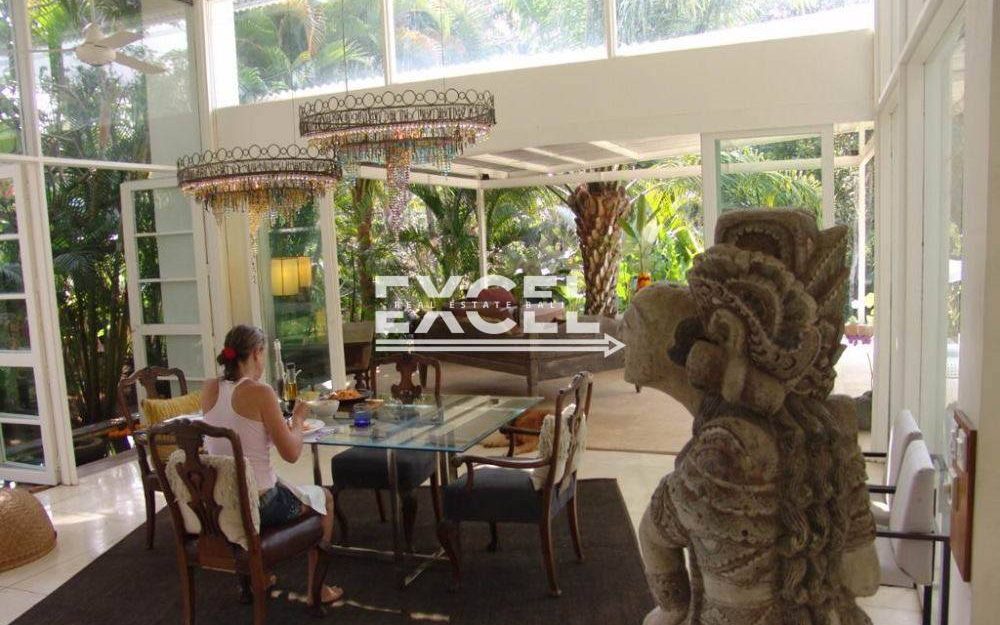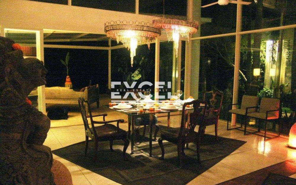 The outdoor sun loungers are perfect for relaxing by the pool connected to the open space living equipped with teak wood large coffee table. A stylish designed living room is equipped with a large sofa and cushions television. While the dining area is beautifully arranged with the high ceiling roof.