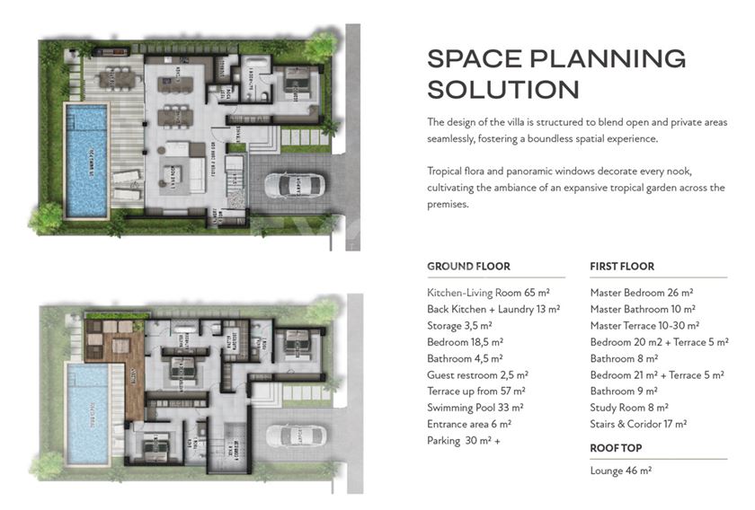 The villa complex, each offering a harmonious blend of contemporary design and natural beauty. The villas over two floors, feature multiple bedrooms and bathrooms, spacious living areas, and additional amenities like study rooms, balconies, and terraces. Each villa is designed for comfort and luxury, ensuring a serene living experience.