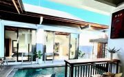 The villa features a large living room with an open kitchen, dining table, TV, and lounge area that overlooks the swimming pool, gazebo, and garden. The villa is fully equipped and decorated with great attention to detail.