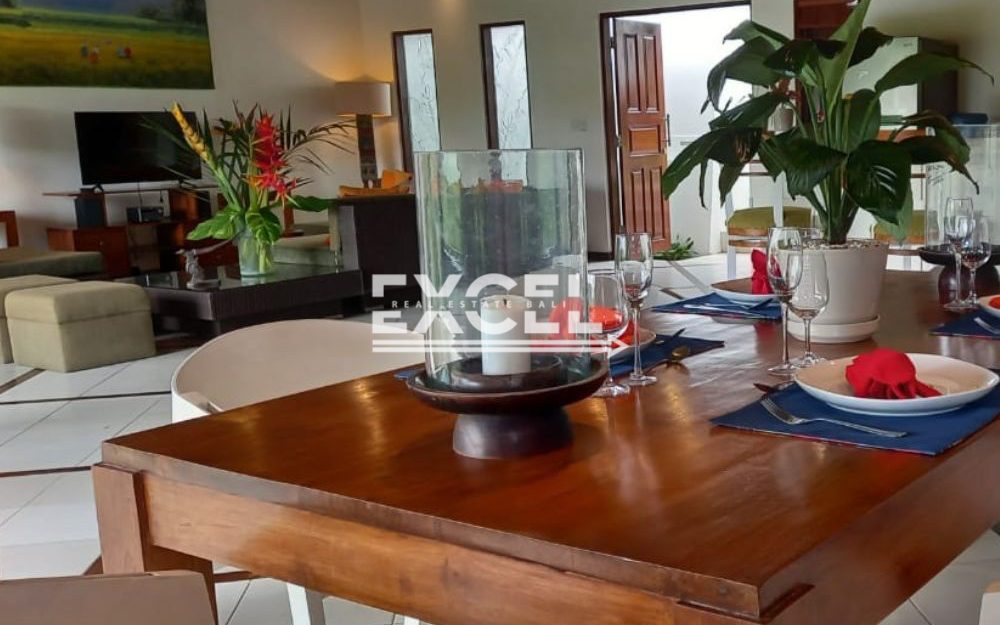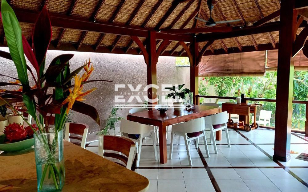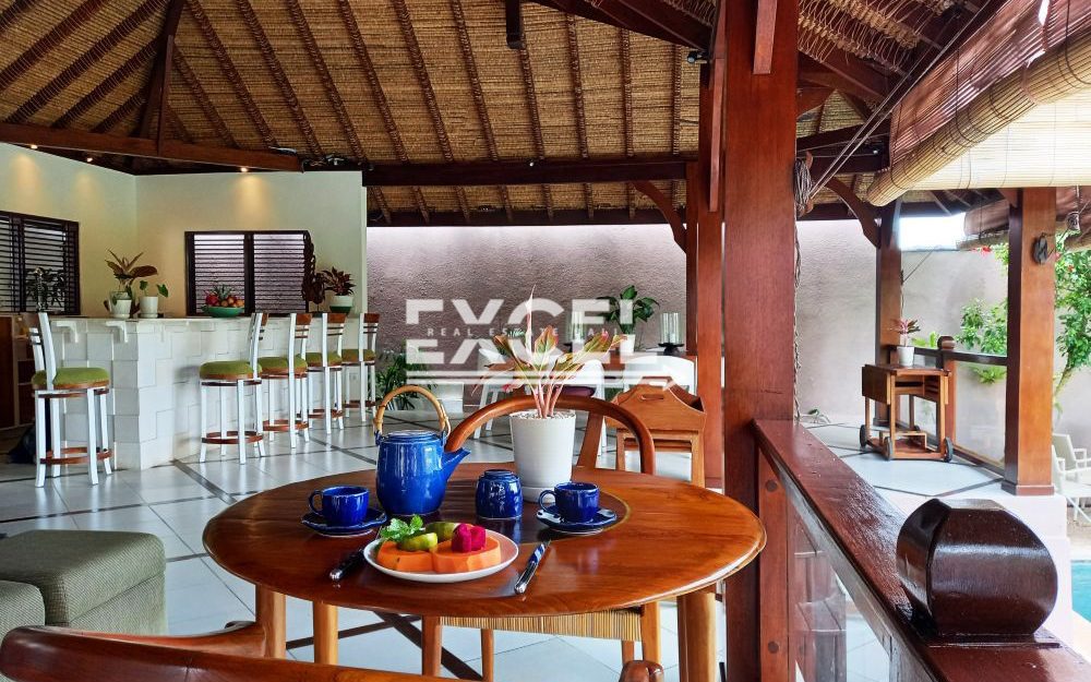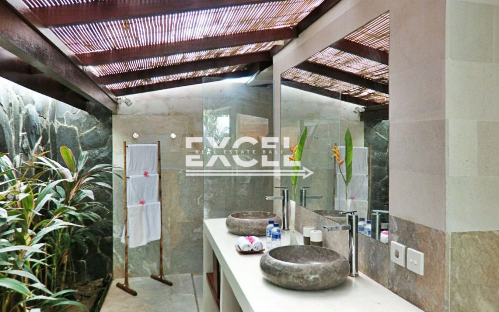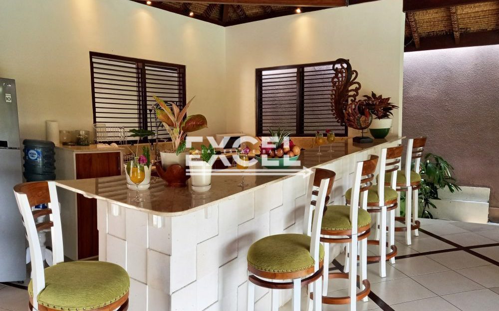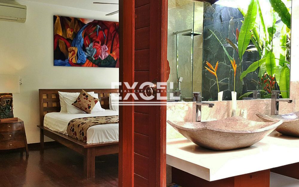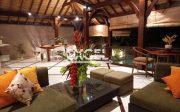 The villa features three spacious bedrooms all with en-suite bathrooms, outdoor living/ dining pavilion under high traditional ceilings of Alang-Alang . Fully furnished with beautiful landscaped gardens with indoor and outdoor water features and swimming pool of quarried green rock.
