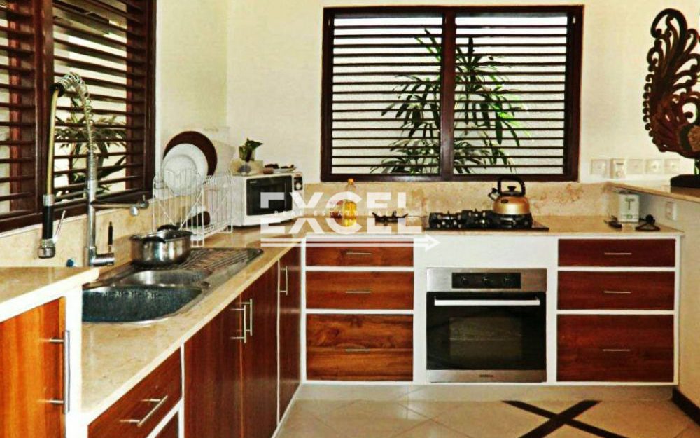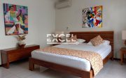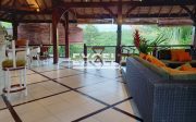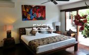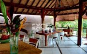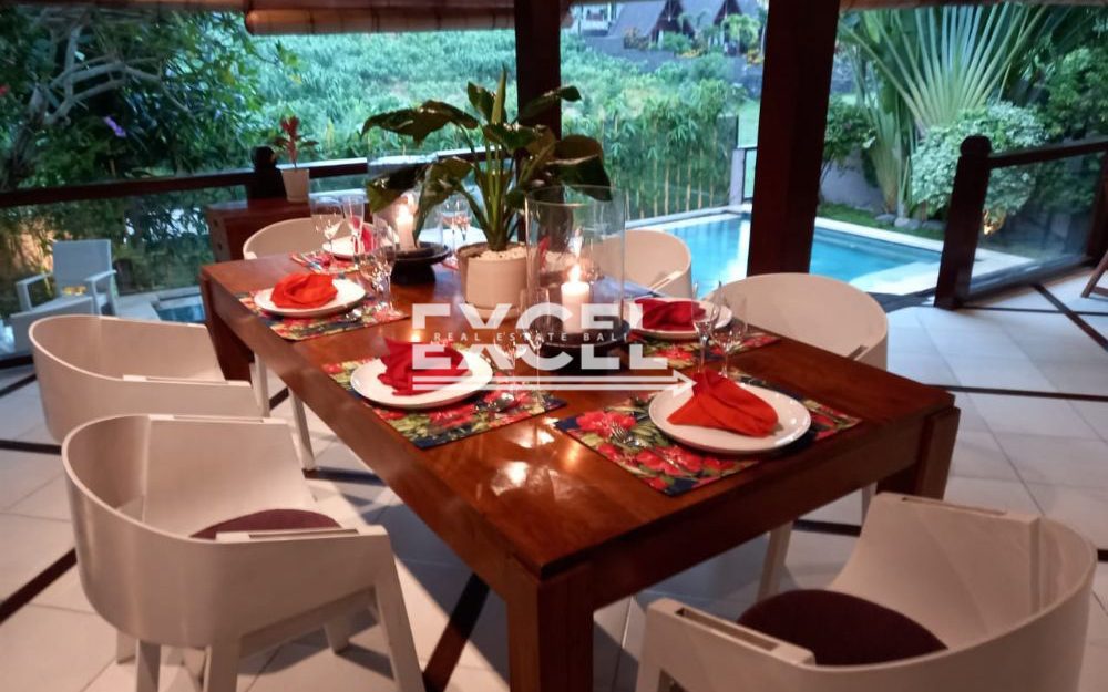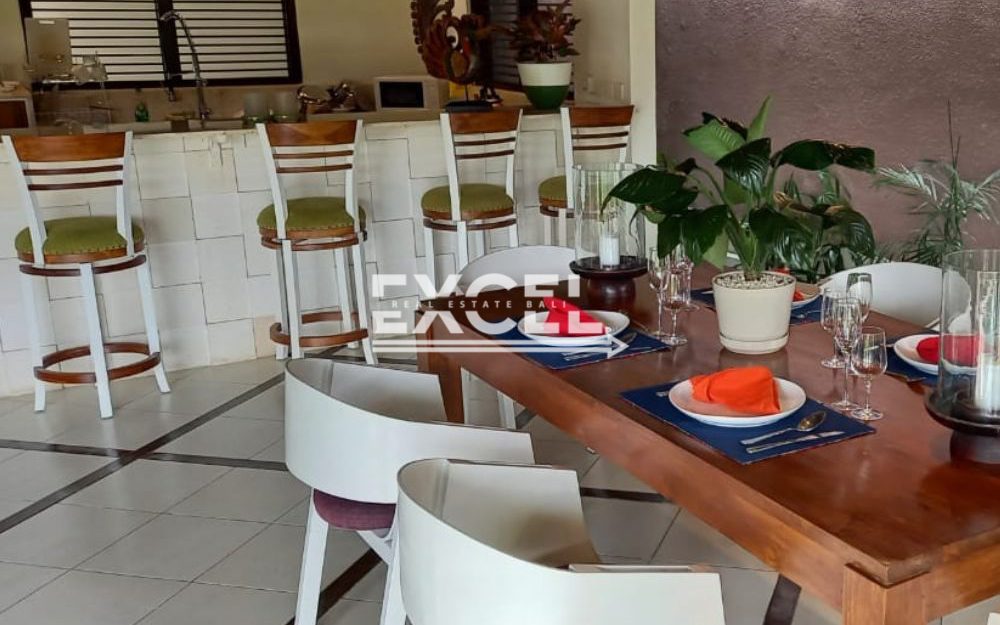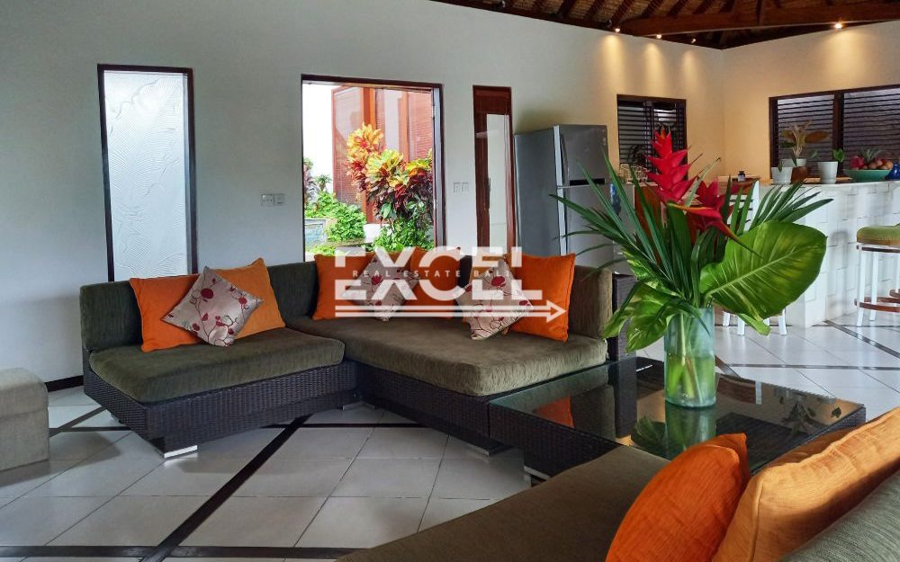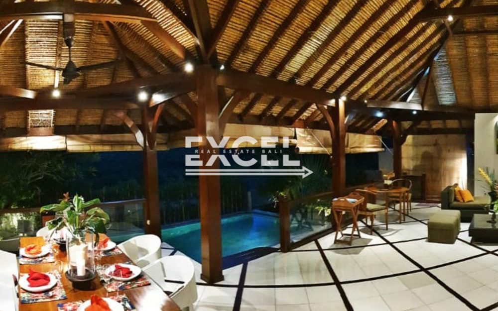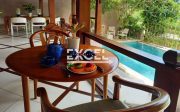 The villa features three spacious bedrooms all with en-suite bathrooms, outdoor living/ dining pavilion under high traditional ceilings of Alang-Alang . Fully furnished with beautiful landscaped gardens with indoor and outdoor water features and swimming pool of quarried green rock.