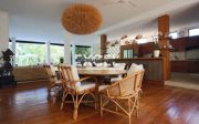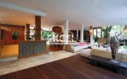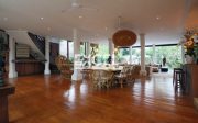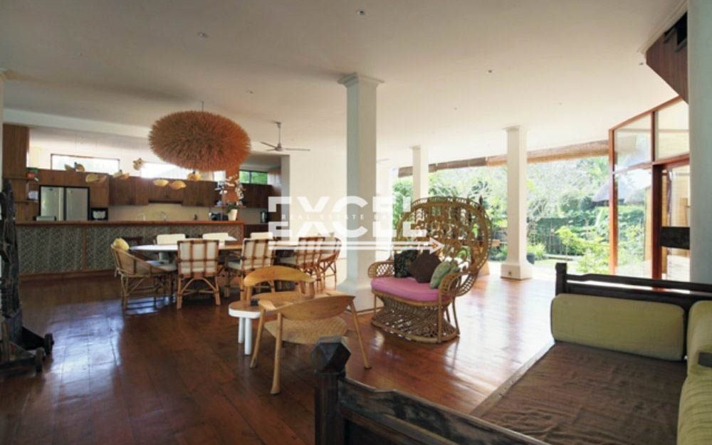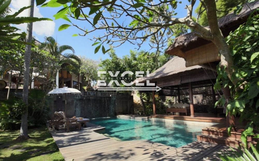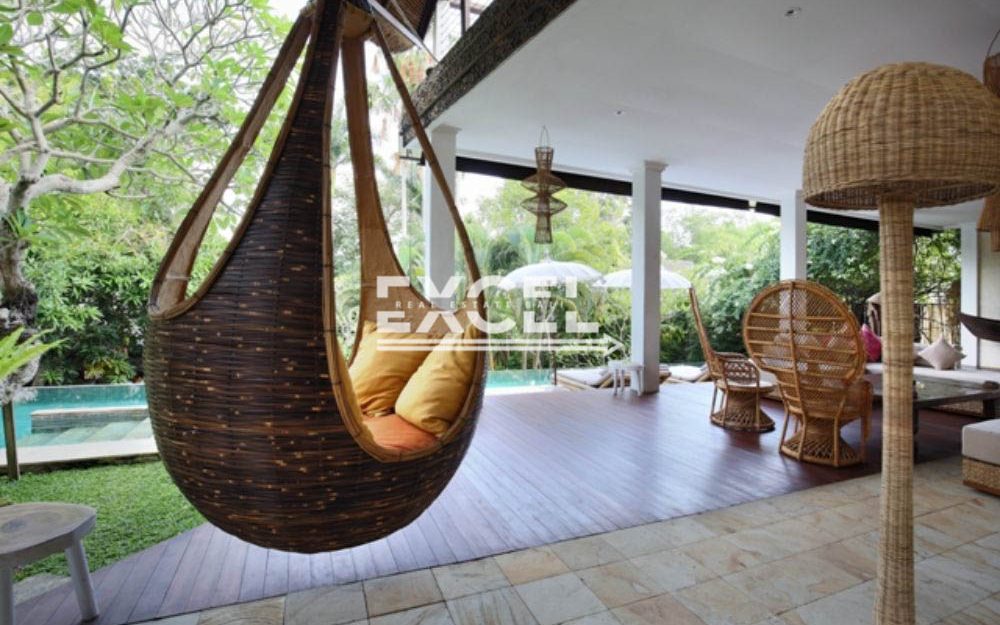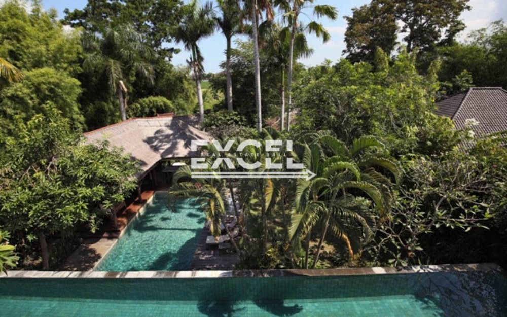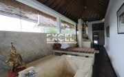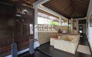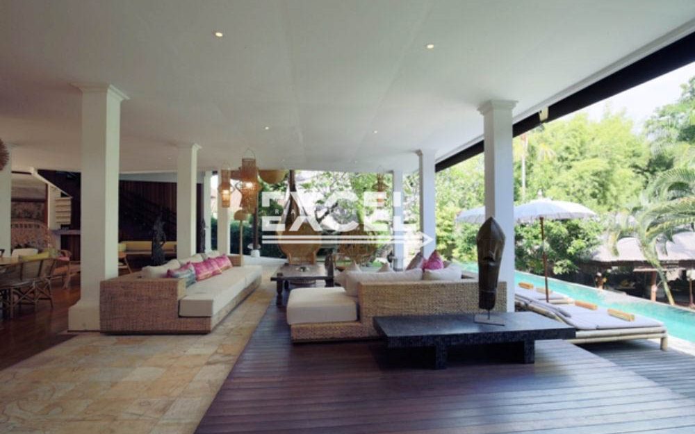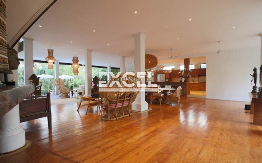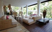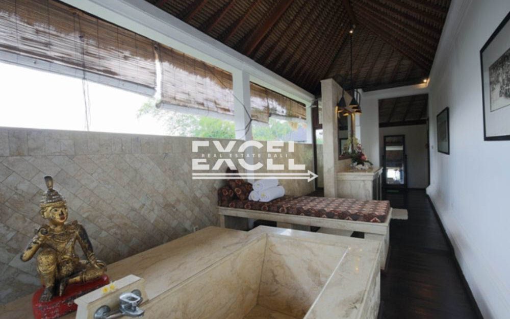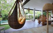This stylish villa has incorporated an adequate Balinese style and very recently had been completely renovated. The wooden architecture of the separated ‘alang alang’ roofed buildings is in harmony with the well-arranged ponds and the two large swimming pools, one falling into the other, nicely integrated within the flourishing tropical garden. Down a quiet road, the villa rests on 2 stages of land. The 2 floored main building is on the higher stage. The ground floor is composite of a large open living room with a relaxation area featuring sofas and a coffee table. In the middle is a large dining table including 12 seats, perfect for dining with a group or family. Furthermore, the kitchen has been completely renovated and is now a large open fully equipped kitchen, overlooking the dining room. In the same place, there is also a media room with a large flat screen TV with DVD and CD player, including an office space with computer and international phone.