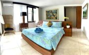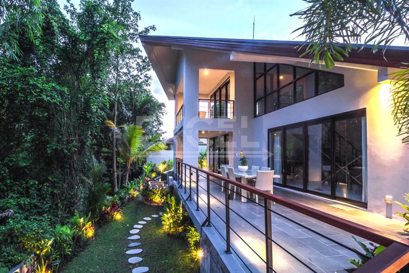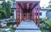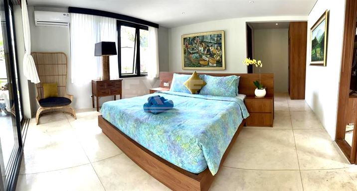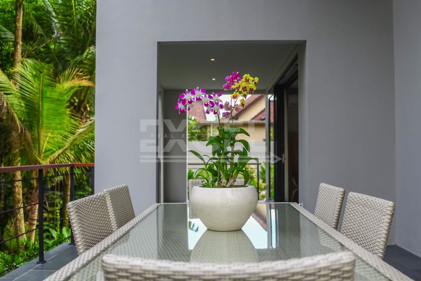 Villa no 2 with a building size of approx. 250m2 elevates luxury with its two-story layout and abundant terrace space. The spacious villa features a kidney-shaped pool with decking and a sun lounge area, perfect for relaxation. The master bedroom (AC) is located upstairs, complete with a large ensuite and extensive wardrobe space. It also boasts a large private covered balcony that offers stunning views over the river. The second bedroom (AC) on the ground floor has direct terrace access and a private ensuite. Conveniently located off the living room and kitchen is a guest toilet, accessible for pool users. Additional amenities include a laundry facility off the bathroom. The villa is surrounded by a beautifully manicured garden, a koi pond, and views of the rice paddies.