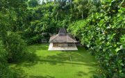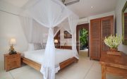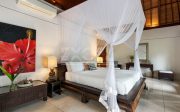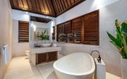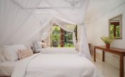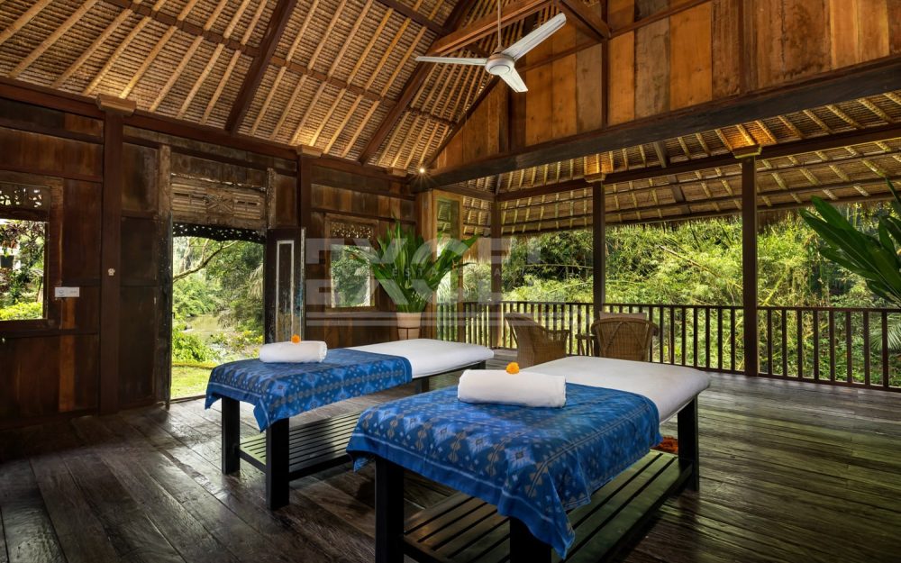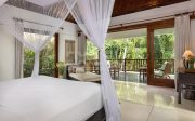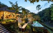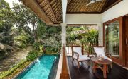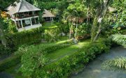 There are 6 individual villas on the property. All villas feature stone floors, traditional Balinese thatched roofing with beamed high ceilings. The beds are all sumptuous super King size, four-poster beds with vast netting all around (only one room has two large single beds). The beds are comfortable and luxurious and made up with crisp white Egyptian cotton sheets. All rooms have air conditioning and ceiling fans. Each villa has a large en-suite with tropical indoor/outdoor shower and huge stone egg-shaped bath tubs. Each villa features its own private outdoor balcony / terrace seating area, overlooking the pools, tropical gardens, jungle, flowing river and rural rice fields. The property is surrounded by natural beauty. The gardens are abundant with treasures: tall, verdant palms, tropical birds and smooth stepping stones across the lotus pond.
